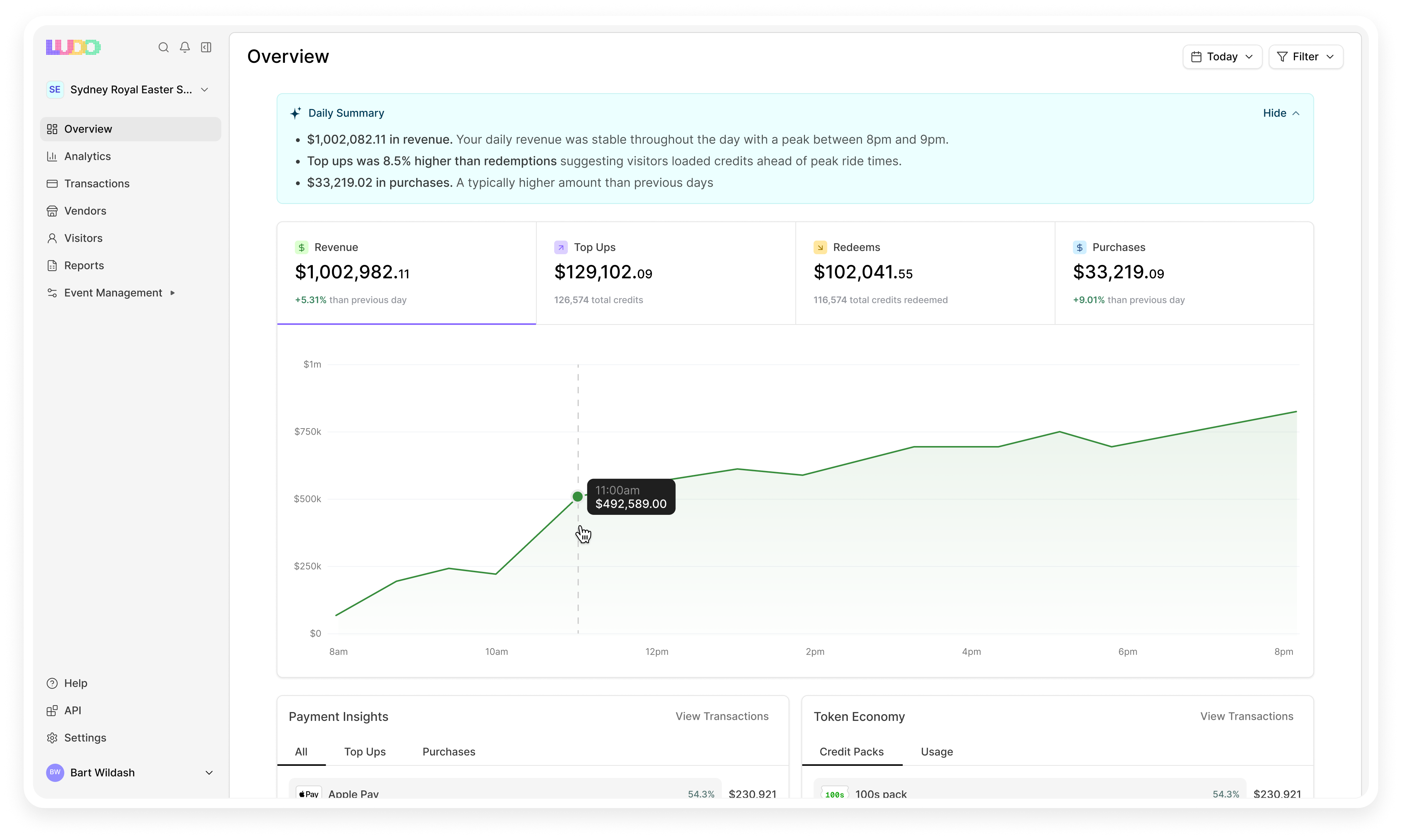 Every transaction is visible the moment it happens: across every vendor, every terminal, every payment method. No end-of-day exports. No waiting for spreadsheets. Revenue, terminal health, and crowd pressure are live from open to close.